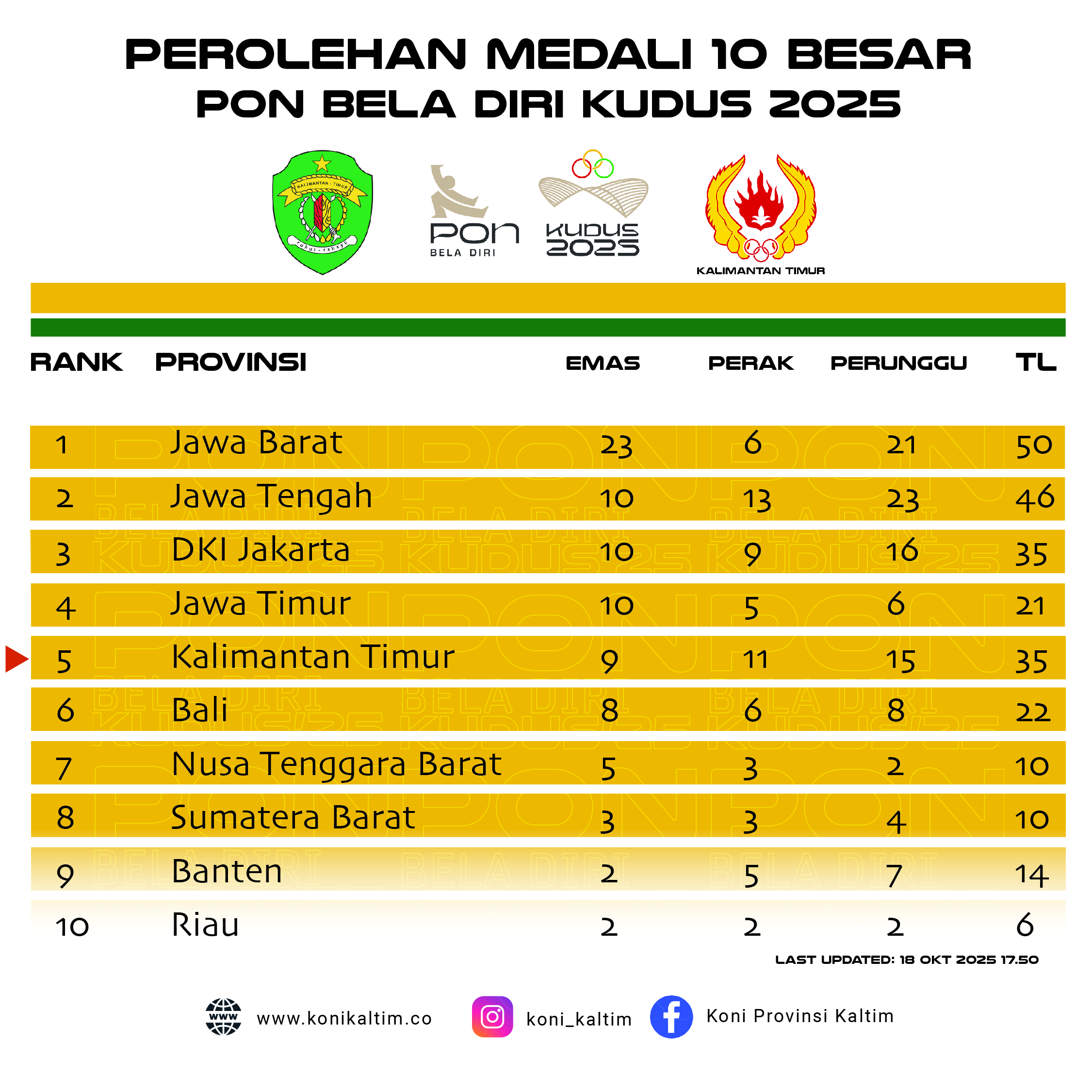 KONTINGEN Kaltim terus melanjutkan perjuangannya dalam persaingan di Pekan Olahraga Nasional (PON) Bela Diri I/2025 di Kudus, Jawa Tengah. Hingga Kamis (16/10), kontingen Bumi Etam telah berhasil mengoleksi 8 emas, 9 perak, dan 14 perunggu, dan menduduki peringkat keempat klasemen sementara.
